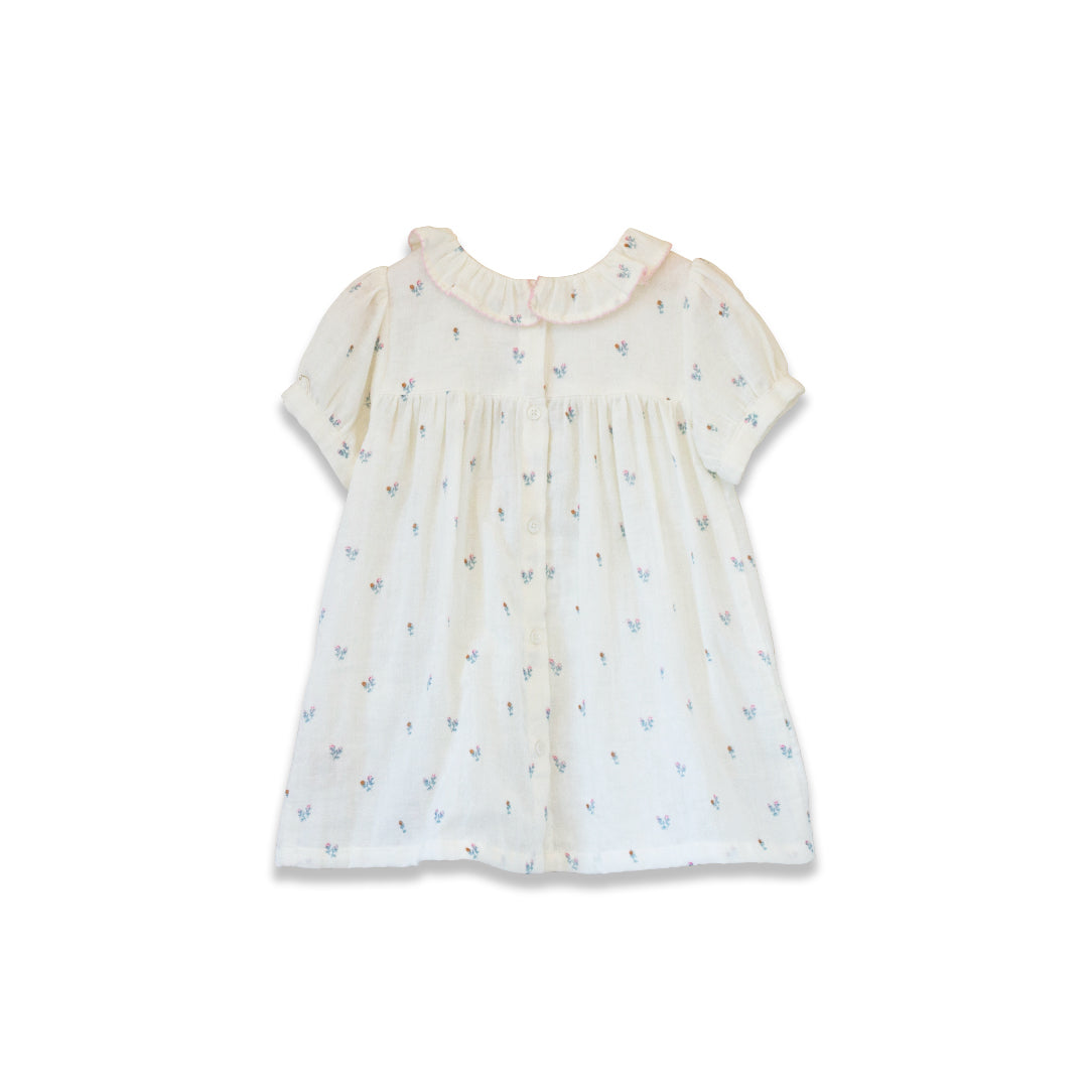 The adorable toddler dress features an empire waist, charming ruffle collar with a beautiful pink lace trim, adding dollops of cute elegance. The short puff sleeves keep it playful and stylish, while the convenient back buttons make dressing a breeze. Crafted from high-quality cotton voile in a stunning florals, this dress ensures comfort and durability for your child's active days. The dress has a gentle drape that looks cute with bloomers, skirts, leggings or any choice of favorite bottoms.   Ages: 6 months to 4 years.